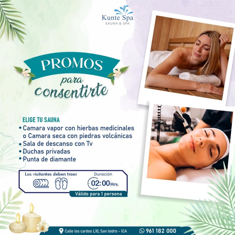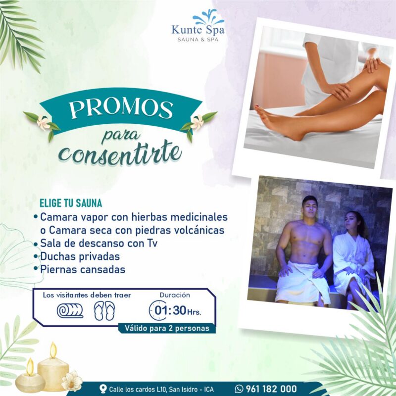 S/ 120.00Sede: Ica Duración: 1 hora 30 min Capacidad: 2 personas Incluye: - Sauna a elección (seco y vapor)