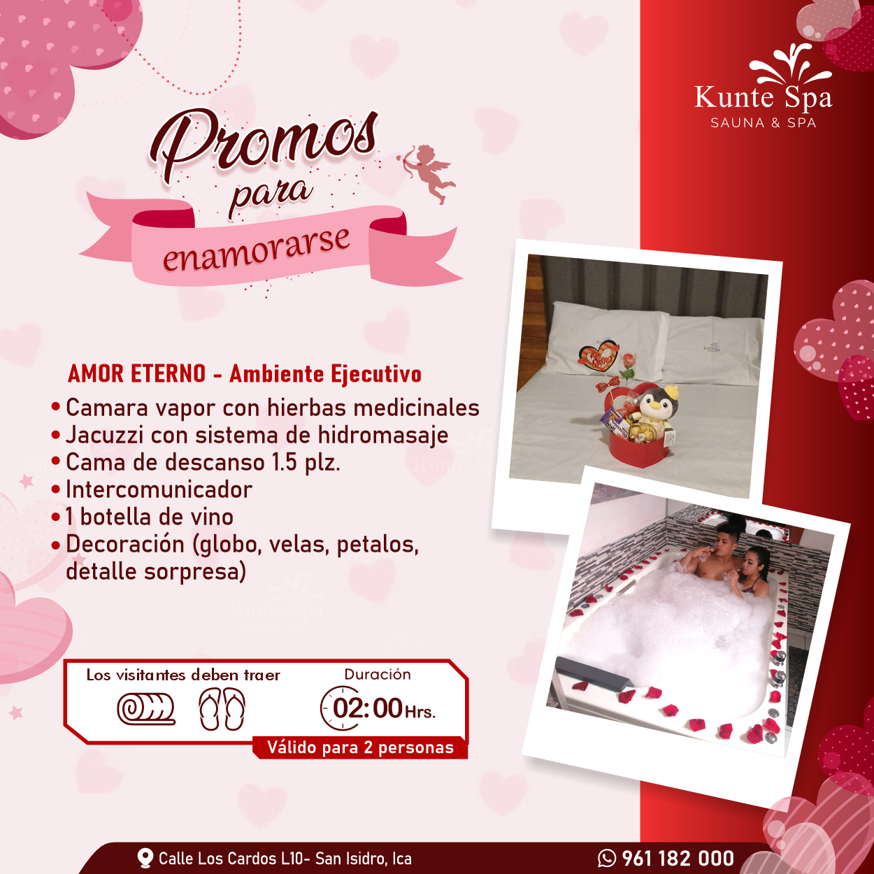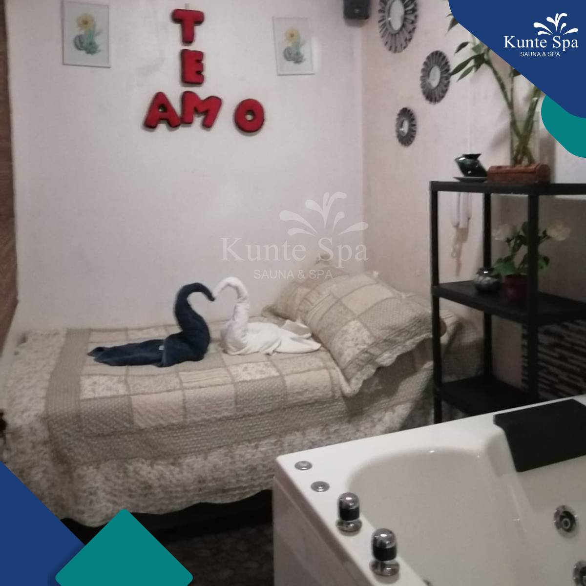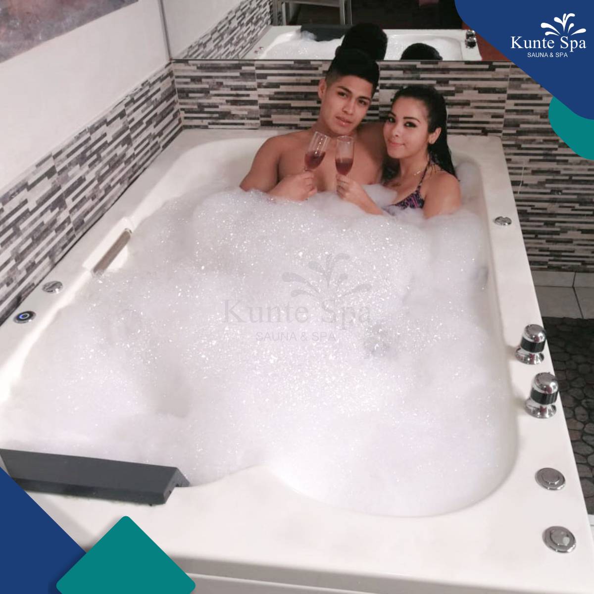Nuestro jacuzzi con hidromasaje para 2 personas está diseñado para que se olviden del estrés, se conecten entre ustedes y disfruten un momento de calma, confort y bienestar en un ambiente íntimo y relajante en Kunte Spa.